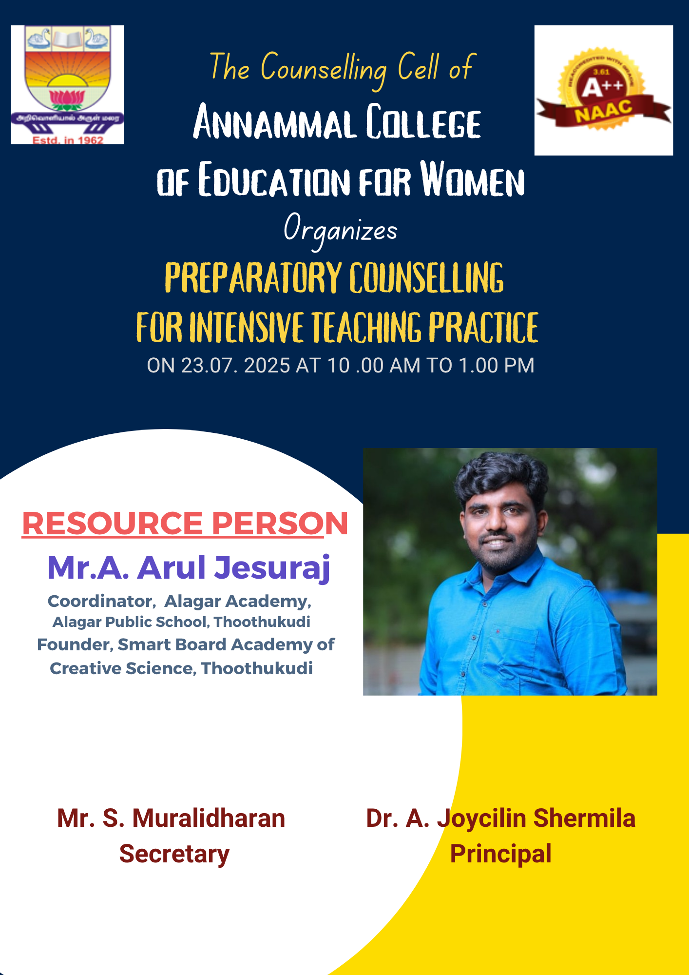 We are delighted that you have taken your first step towards becoming a teacher. We are keen on taking you through the preparatory programmes for teacher training with utmost care so that you shall become a productive and competent teacher. In its fifty six years of operation, Annammal College of Education for Women has managed to carve a niche for itself in the world of Teacher Education by virtue of its emphasis on quality education. We at Annammal College of Education for Women offer you an educational experience second to none supported by an extensive range of facilities. It is our desire that you make the best use of what is available here to enrich your academic pursuits. We welcome you to create a mutually rewarding relationship.